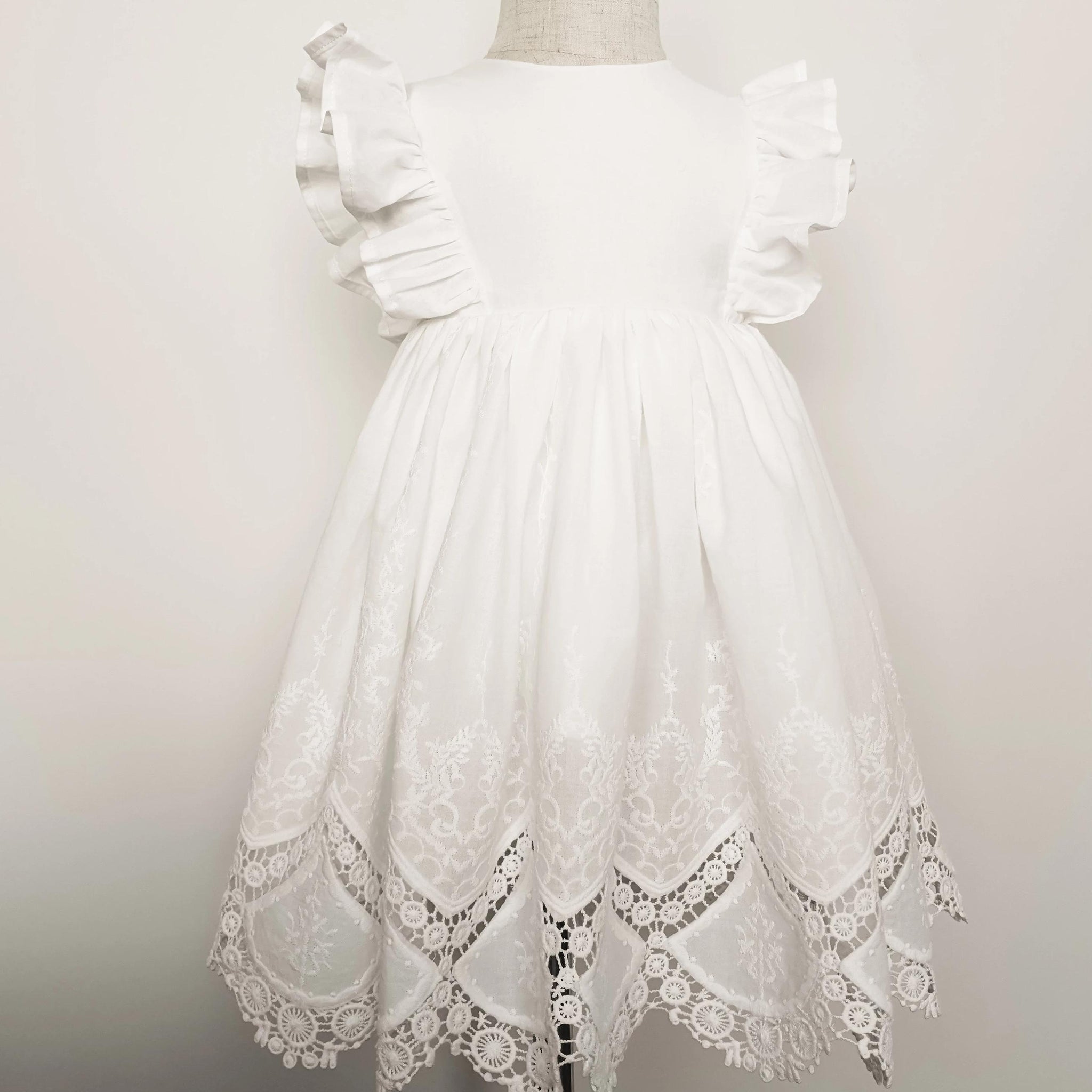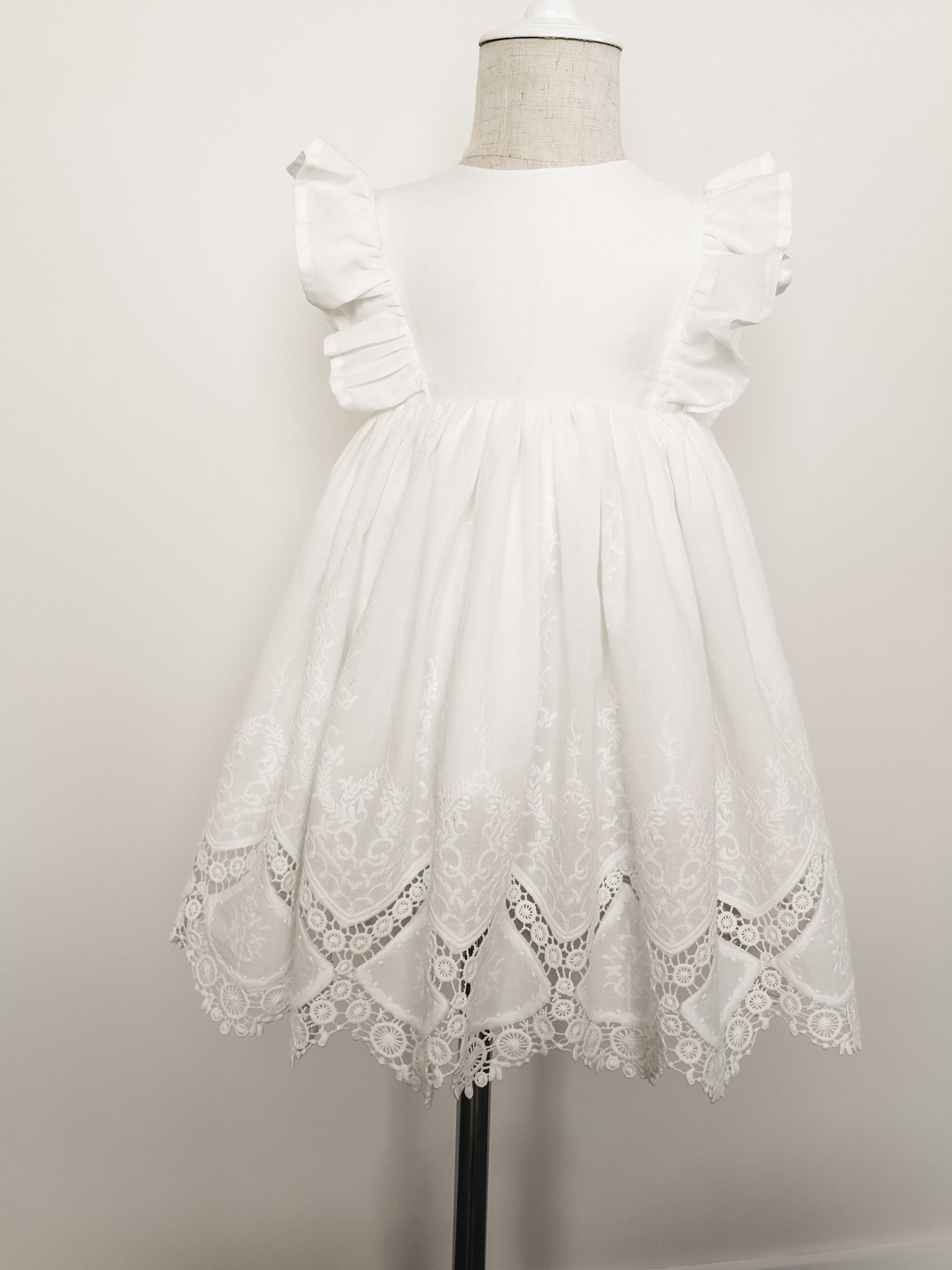 Our Amelia Dress consists of a gorgeous embroidered cotton lace in ivory with another layer of cotton lining. The lace scallop edging has a gentle floral pattern through it and it has frilly sleeves and three fabric covered buttons at the back.
