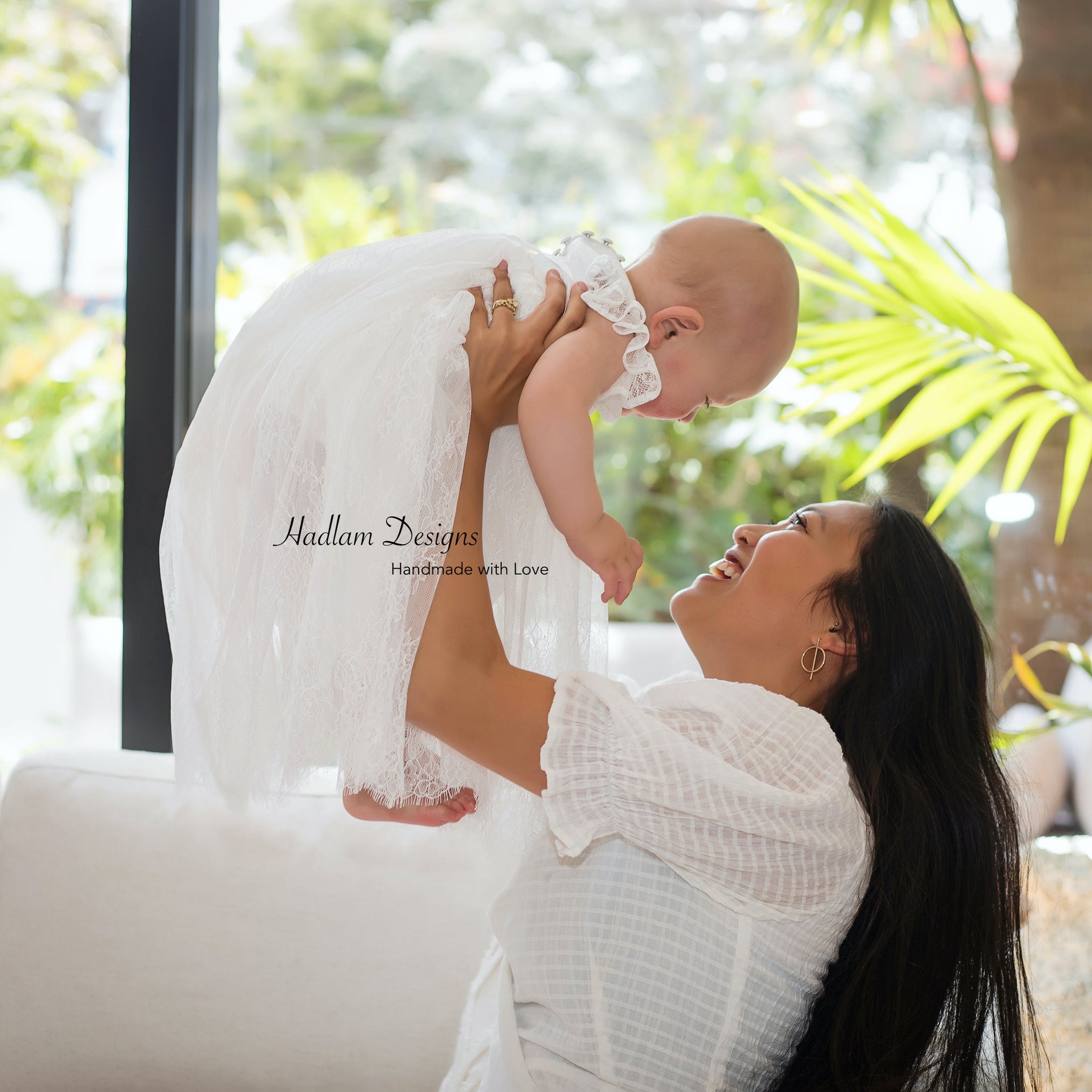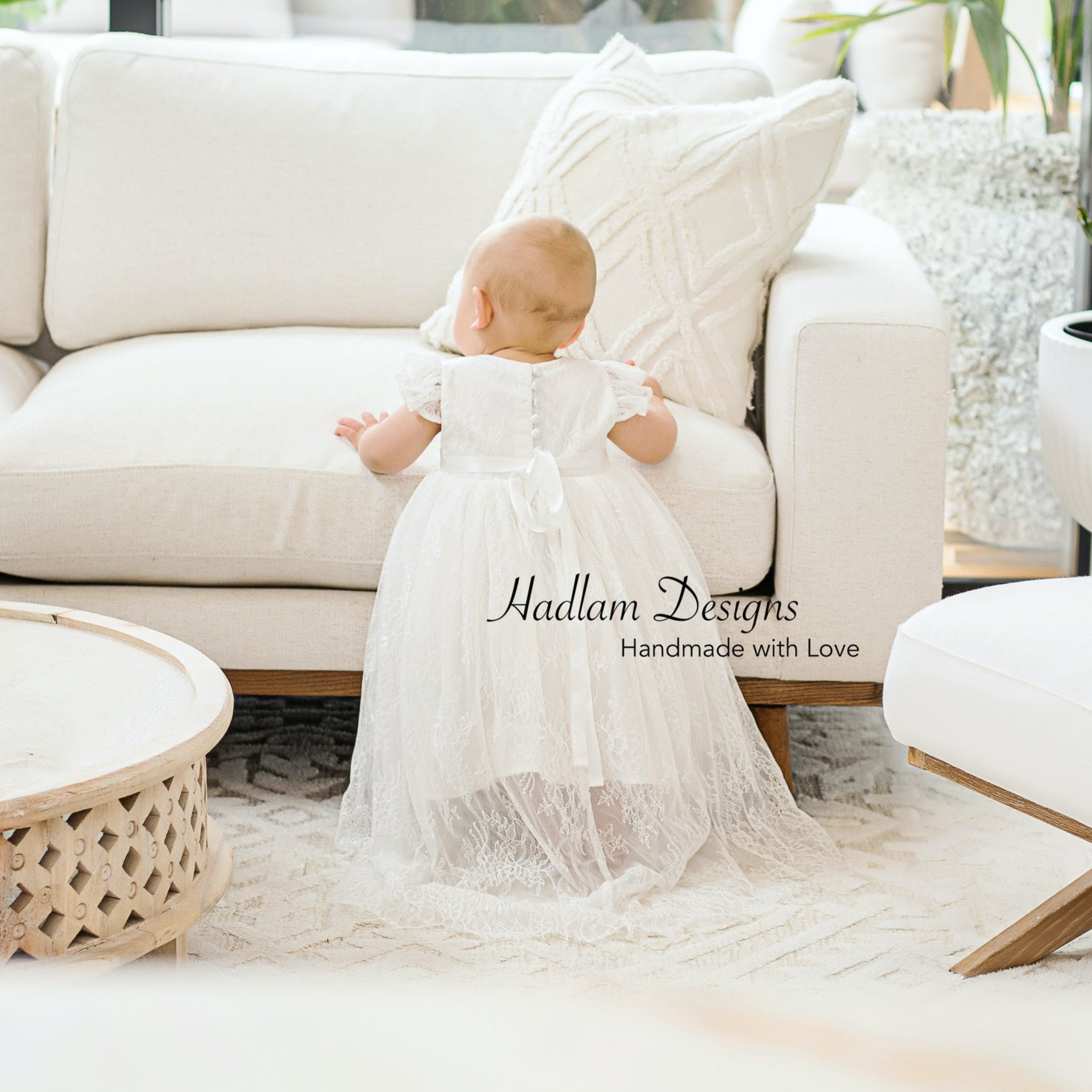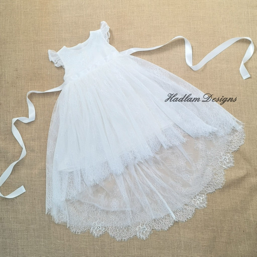 Our Celine Mini consists of a gorgeous delicate lace in off white with two layers of bridal tulle and cotton lining. The lace has a gentle floral pattern through it and a gentle scallop hem. It has little frilly sleeves and has three fabric covered buttons at the back and an off white ribbon around the waist that ties into a bow at the back. The front hem hovers above the feet and the back of the skirt has a beautiful mini train.