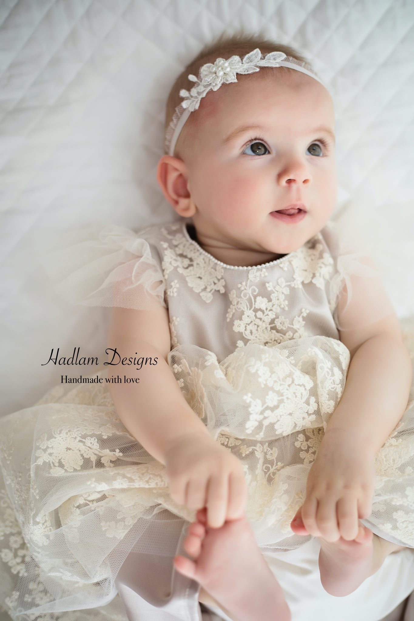 The outer layer of our Grace dress is a beautiful cream embroidered baby floral lace. The lining is a gorgeous soft champagne coloured satin. There is a layer of netting in the skirt, and the sleeves are pretty double layered frill. There are pearl buttons at the back, the neckline is also trimmed in a line of mini pearls. The dress in finished with a ribbon that ties around the waistline.