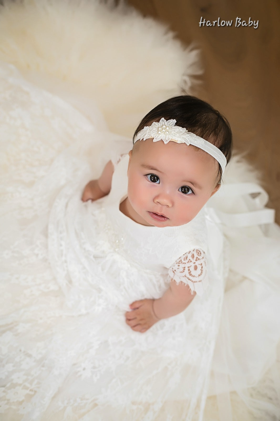 Our beautiful Sierra Gown consists of a gorgeous bold lace in ivory with two layers of soft bridal tulle and cotton lining. The lace has a striking floral pattern that is bound to draw complimenting attention. The sleeves are little cap sleeves using the same scallop edge as the skirt hem. It also has three fabric covered buttons at the back and an ivory ribbon around the waist that ties into a bow at the back.The gown does not come with beaded lace waistband seen in some of the pics- there is a plain ivory ribbon around the waistline.