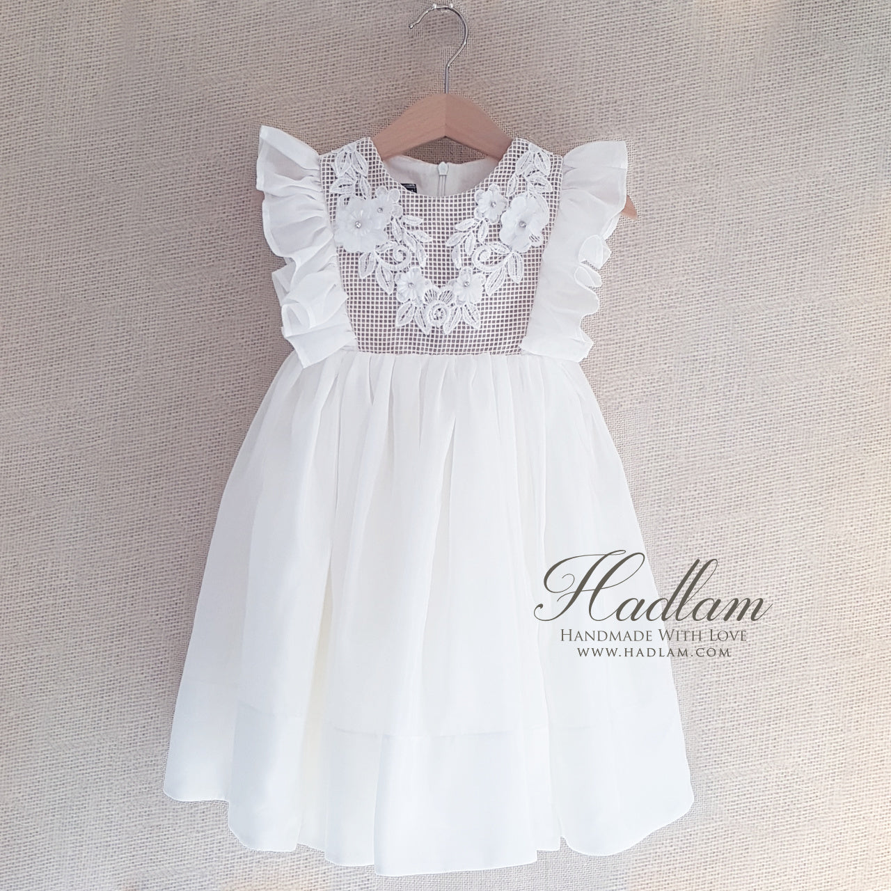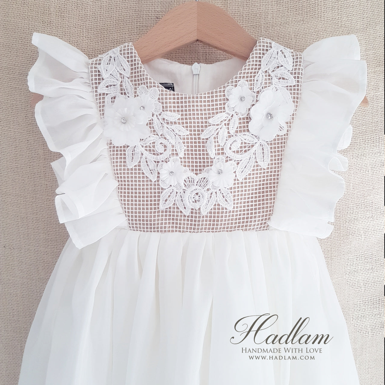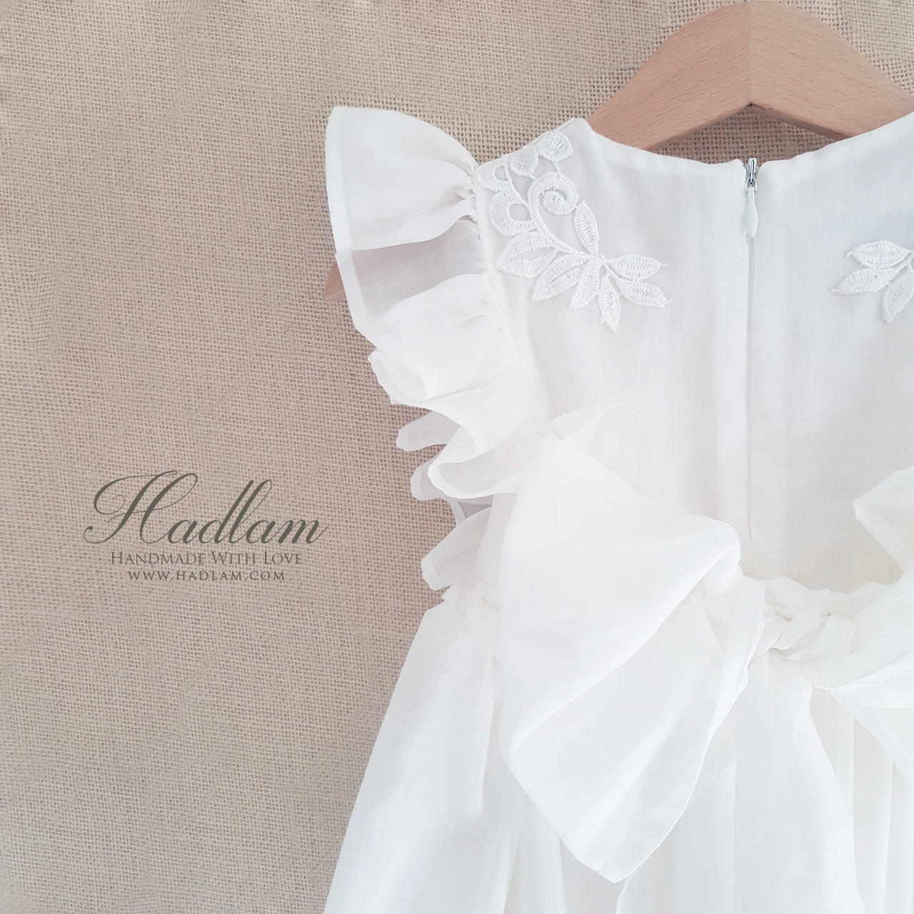 Our Tahlia dress is made up of a beautiful soft silk cotton outer layer and 100% cotton lining. The front of the bodice has a gorgeous v-shaped panel that is made of a dark beige cotton and netting overlay. Over that is also a beautiful floral lace trim that goes over the shoulders and into the back bodice. On the sides of the bodice are two soft silk frills that starts from the front waistline over the shoulders and into the back waistline. The back has a zip and a silk sash that ties into a bow.