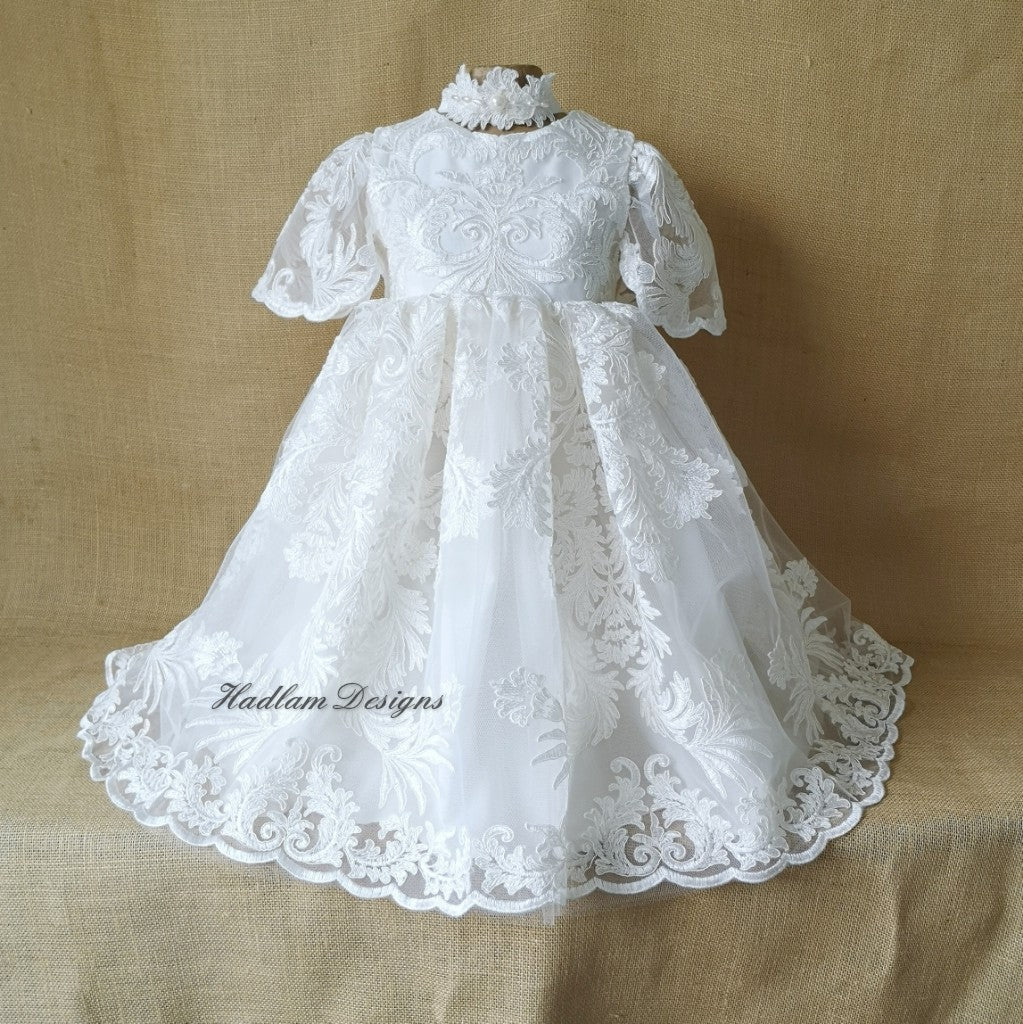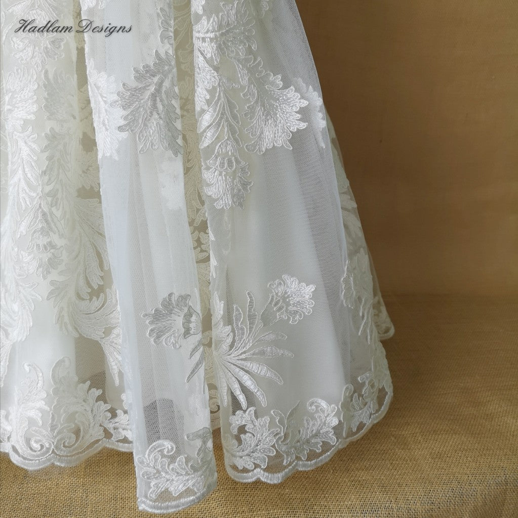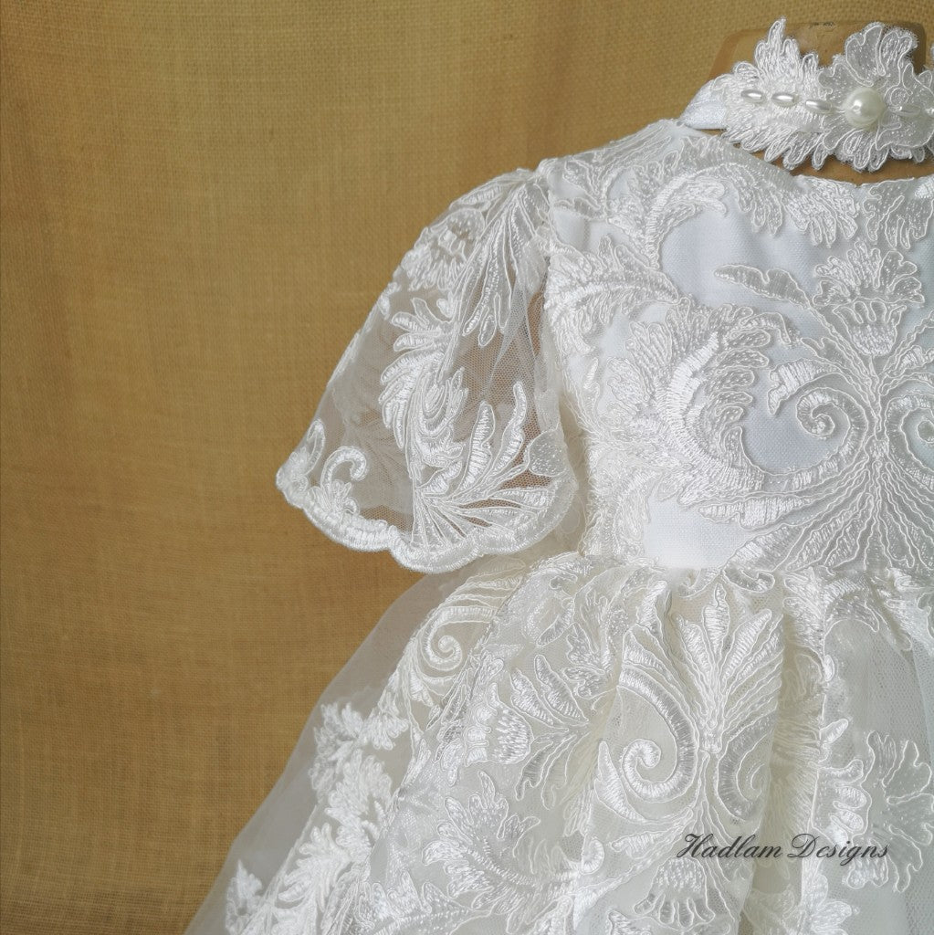 Our Vivienne Mini is made of a beautiful bold lace, with cotton lining. The lace has a bold floral pattern through it. There are three fabric covered buttons at the back. There is also two layers of soft tulle in between the lace and underlay of the skirt giving it volume. The sleeves are long to the elbows and are open and loose.